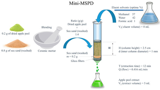 Currently, the extraction of phenolic compounds from fruit by-products attracts great attention. When it comes to the extraction of polyphenols from apple peel, it mostly includes solvent extraction, ultrasound assisted extraction [13,18], microwave, supercritical CO2 extraction and other treatments [19]. One of the newest methods applied for the extraction of polyphenols is matrix solid-phase dispersion (MSPD) extraction. Matrix solid-phase dispersion was invented in 1989 and patented by Barker in 1993 [20]. Since then, it has found an important place among the preparation techniques applied in the analysis of solid, semi-solid and viscous samples [21]. MSPD extraction is based on blending the sample matrix with solid support in a mortar, after which the obtained mixture is used as pre-column packing, from which analytes are eluted with a suitable solvent. The main advantage of MSPD over the classical extraction procedures is performing extraction and clean up at the same time [20]. The sample amount in the classical MSPD protocol is 0.5 g; this can be significantly reduced by MSPD miniaturization, which consequently reduces the consumption of sorbent, solvent and the preparation time [22,23]. MSPD is used for the extraction and isolation of polyphenols from pomegranate peel [24], Lamiaceae family [25], grape marc [21], blackcurrant powder [26], Radix Astragali [27], etc. To the best of our knowledge, the use of matrix solid-phase dispersion for the extraction of polyphenols from apple peel has not been considered at this moment. In studies dealing with apples, MSPD was mainly used for the determination of pesticides and mycotoxins in apples and apple-based products [28].
