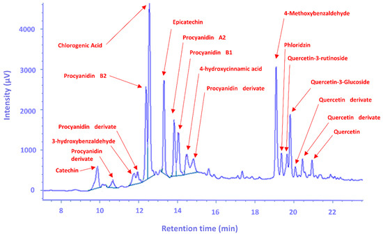 Many studies emphasize the health-promoting effects of different polyphenols. Some of these polyphenols were extracted in this study in great abundance (≥1000 µg/g dw). First of them is epicatechin (>1300 µg/g dw), it was reported that the consumption of epicatechin reduces blood glucose levels in diabetic patients and has an anticancer effect, which was attributed to its antioxidant properties, as well as antiangiogenic and direct cytotoxicity to cancer cells [44]. The second one is procyanidin B2 (>1500 µg/g dw). Studies have shown that proanthocyanidins help in protecting the body from sun damage, improving the flexibility of heart tissues, improving blood circulation by strengthening blood vessels and even improving vision [45]. Furthermore, quercetin-3-rutinoside (>2300 µg/g dw), Que3glu, has been used conventionally as an antimicrobial, antifungal and anti-allergic agent and certain research has shown pharmacological benefits for the treatment of various chronic diseases such as cancer, diabetes, hypertension and hypercholesterolemia [46]. Finally, chlorogenic acid (>2300 µg/g dw), CA, is also an important and biologically active dietary polyphenol, playing several important and therapeutic roles, such as antioxidant activity, antibacterial, hepatoprotective, cardioprotective roles, etc. In addition, it has been found that CA could modulate lipid metabolism and glucose in both genetically and metabolically related health disorders [47].