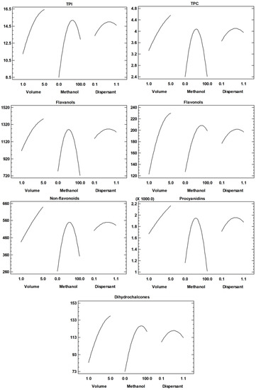 Regarding the extraction volume, the linear positive effect was found to have a significant influence on the investigated responses. The linear positive effect indicates that increasing the particular factor will result in greater yields of the observed response, which in this case means that increasing the volume of the extract will result in greater yields of all polyphenol groups [32]. Dispersant mass was not significant for the polyphenol yields. For the methanol percentage, the linear positive effects were also found to be statistically significant for total polyphenolic index (TPI), flavonoles, non-flavonoids and dihydrochalcones. Additionally, a significant negative quadratic effect was found for all investigated responses, which means that there is a maximum of the factor that does occur at some intermediate value (Table 3). A graphical representation of such parabolic behavior is shown in Figure 4. The observed behavior was previously reported by Álvarez-Casas et al. [33], who optimized the process of pressurized solvent extraction of polyphenolic compounds from white grape marc, as well as Assefa et al. [34], who studied the extraction of antioxidants and flavonoids from yuzu peel (Citrus junos Sieb ex Tanaka) and Iglesias-Carres et al. [32], who optimized the process of polyphenol extraction from sweet orange pulp. The same negative quadratic effect was found for flavonoles regarding extract volume (Table 3). The practical meaning of the interaction of a controlled factor with itself implies a quadratic model should explain the behavior of such a factor, which in practical terms implies that the optimum is somewhere in the middle of the experimental domain, not in the lowest nor the highest explored values. Moreover, the interaction between the factors, the extract volume and the methanol percentage was significant for TPI and flavonols. These results demonstrate that each individual polyphenolic compound group requires specific extraction conditions, which were expected considering different chemical nature and polarity of the polyphenolic compounds [35]. In this context, multiple response optimization was used for selecting the compromising conditions for obtaining the highest total polyphenol yields. The optimal conditions for the extraction were 5 mL of extract volume and 57% of methanol in the extraction solvent. Even though dispersant mass was not significant for the polyphenol yields, 0.8 g was chosen due to better operative conditions during the extraction procedure. The set mass of sample (0.2 g) and the mass of dispersant (0.8 g) provided the matrix/dispersant ratio of 1:4 (m/m).
