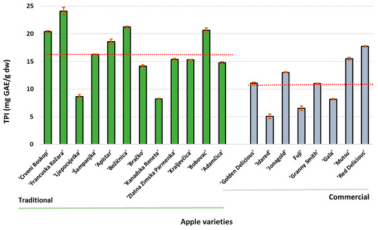 The total polyphenolic index of traditional and commercial apple varieties from Croatia. The red line is the average total polyphenolic index (TPI).