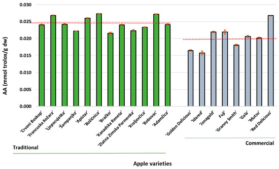 The antioxidant activity of traditional and commercial apple varieties from Croatia. The red line is the average antioxidative activity (AA).