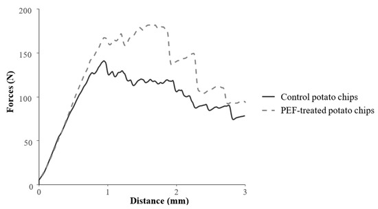 Table 2 summarizes the physicochemical parameters of potato chips used in this study. On average, the energy density was 2.97 ± 0.20 kcal/g for the PEF-treated potato chips and 3.22 ± 0.22 kcal/g for the control potato chips. The texture analysis recorded that the maximum forces required to penetrate PEF potato chips was 182.26 N and for control chips was 140.91 N. The t-test on the data from the texture analysis showed that on average, the PEF-treated potato chips required significantly (p < 0.01) stronger force to penetrate through the potato chip compared to the control chips (see Figure 1), suggesting the former had a harder texture.