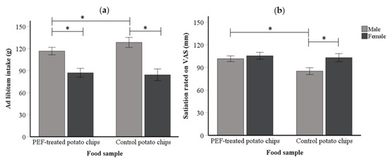 Comparison between genders on their ad libitum intake (a) and perceived satiation (b) of the PEF and control potato chips. The PEF-treated potato chip (associated with harder texture) refers to the potato chips treated with the pulsed electric fields (PEF) technology and the control potato chips refer to untreated with the PEF potato chips. The * indicates significant difference at p ≤ 0.05.