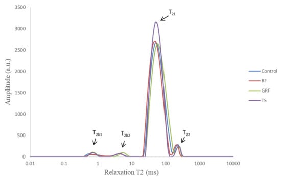The water proton mobility and distribution, analyzed by the LF-NMR tool, reflect how the water and microstructural characteristics of the meat protein matrix are affected by their composition, type of ingredients added, and processing conditions, including heating or freezing processes. As shown in Figure 1, the transverse relaxation time (T2) curves of an emulsion-type sausage formulated with RF, GRF, or TS had a multi-exponential distribution with four distinct peaks (T2b1, T2b2, T21, and T22) of water populations that were approximately located between 0.5–1, 3–10, 40–90, and 200–400 ms respectively. The growth of these four different T2 relaxation time water fractions could be induced by the components surrounding the protein network and by the distance between the water proportions distributed in the emulsion systems. T2b2 represents water closely associated with macromolecular structures [] and macromolecular protons in water-plasticized structures []. T21 is classified as entrapped or immobilized water molecules (82%–90%) within the myofibrils with relaxation times ranging from 10 to 100 ms []. T22 represents water located between fiber bundles or water molecules outside the highly compacted protein matrix with relaxation times ranging from 100 to 400 ms [,].