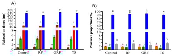 Relative values of T2 relaxation times (T2b1 ■, T2b2 ■, T21 ■, and T22 ■) and water proportions peak area (P2b1 ■, P2b2 ■, P21 ■, and P22 ■) of an emulsion-type sausage formulated with rice flour (RF), glutinous rice flour (GRF), or tapioca starch (TS). The significant difference in (A) T2 relaxation time was represented by letters (f, g, m, p, x, y) and (B) (a, b, c, d) for each water proportion peak area per treatment (p < 0.05). Treatments with the same letter showed no significant difference for each (A) T2 relaxation time and (B) water proportion, respectively (p > 0.05).