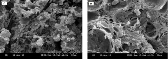 Microstructure of emulsion-type cooked sausage formulated with plant-based starch ingredients.: (A) control, (B) rice flour, (C) glutinous rice flour, and (D) tapioca starch.