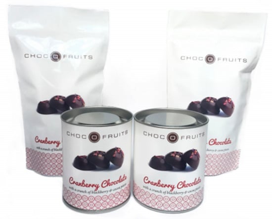 Sampling booth in front of a chocolate assortment in store, displaying one package prototype.