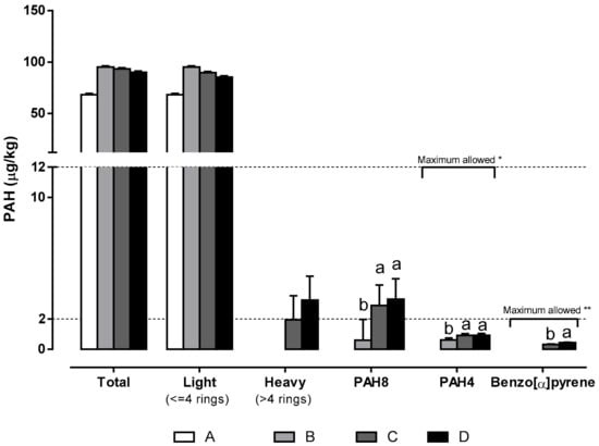 Heavy PAHs were only detected in the products subjected to longer smoking periods (C and D). Eight PAHs (PAH8, benzo[α]pyrene, benz[α]anthracene, benzo[α]fluoranthene, benzo[k]fluoranthene, benzo[ghi]perylene, chrysene, dibenz[a,h]anthracene, and indeno[1,2,3-437 cd]pyrene) were present in all smoked meat products, with significantly higher values in those subjected to longer smoking periods (C and D). This same profile was observed for the four PAHs PAH4, benzo(α)pyrene, benz(α)anthracene, benzo(β)fluoranthene, and chrysene. Benzo(α)pyrene was detected only in products subjected to the smoking regimes C and D, with a significantly higher concentration in those obtained with the longer regime D. Nevertheless, the levels of all these hazardous PAHs were below the maximum limits established by the Commission Regulation (EC) No. 1881/2006 [45] in its consolidated version of 19 March 2018, namely, 12 μg/kg wet weight for PAH4 and 2 μg/kg wet weight for benzo(α)pyrene.