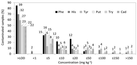 The levels of Cad, Put, and Try in the tested cheese samples were very similar, with 22 to 23% of samples containing detectable concentrations of these BAs, ranging between 1.2 and 213 mg kg