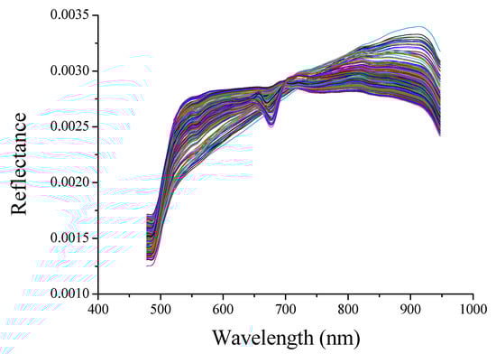 Figure 1 shows the preprocessed reflectance spectra of all fresh-cut potato tuber slices. Since the noise was significant at the head and tail of the spectra, only the spectra in the range 477–948 nm was considered. The spectral trends of all samples were basically the same, but the reflectance in the range of 650–750 nm showed some differences. On the one hand, the reason might be that potato tuber slices were taken from multiple potatoes, and the individual differences between samples were quite large. On the other hand, it might be caused by changes in the water content and surface color of fresh-cut potato tuber slices during placement process. A valley (678 nm) and a peak (705 nm) were observed in some spectral curves. From the perspective of visible light, 678 nm and 705nm were associated with redness. Moreover, the wavelengths near 678 nm and 705 nm were also designated as the fourth overtone of C–H stretch [35]. All the wavelengths contained a mass of complex information about the color and composition of the samples. Multivariate analysis method was applied to explore the relationship between spectra and color indexes (L*, a*, b*, BI, L*/b*) and water content of fresh-cut potato tuber slices.