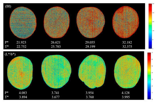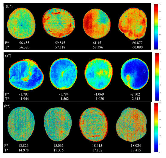 For the prediction of L*, b*, BI and L*/b*, although the values of each pixel are different, it presents a relatively uniform distribution in the whole ROI area. However, it can be seen from Figure 2 (a*) that the part near the middle of the potato sample is found to be darker, corresponding to a higher redness, which is mainly related to the location of browning. In addition, the main purpose of the chromatic aberration method commonly used is to evaluate the overall characteristics of the sample. Though calculating the average of the color values corresponding to each pixel may lose some spatial information, it is more feasible in practical application. In Figure 2, the P* value is the predicted average value of all pixels and the T* value is the actual value measured by the chromatic aberration method. According to the Figure 2 (L*), the values of L* measured by the chromatic aberration method were 56.320, 57.118, 58.396 and 60.090, respectively, which were similar with the average values of all pixels predicted by the LS-SVM model based on full spectra (56.455, 59.545, 61.151 and 60.877). The same phenomena could also be seen from the prediction of other color indicators (a*, b*, BI, L*/b*) in Figure 2, reflecting the validity and accuracy of LS-SVM models based on full spectra. As for BI, the higher the browning degree of the samples, the higher the BI value, which directly reflect the freshness of the fresh-cut potato tuber slices to some extent. Conversely, a higher L*/b* value indicates a higher brightness, a lower yellowness and a lower browning degree of potato tuber slices. The object oriented color prediction map based on LS-SVM model built with full spectra shows great potential to visualize color attributes, which will greatly facilitate the real-time nondestructive measurement in color of agricultural products.