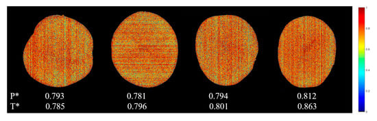 Pixel-wise prediction maps developed on the CARS-LS-SVM models for water content visualization (P* is the predicted average value of all pixels; T* is the actual value measured by the chromatic aberration method).