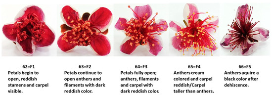 Different flowering stages of feijoa flowers. Petals begin to open: Reddish stamens and carpel visible—F1; petals continue to open: Anthers and filaments with dark reddish color—F2; petals fully open: Anthers, filaments, and carpel with dark reddish color—F3; anthers cream-colored and carpel reddish/Carpel taller than anthers—F4; anthers acquire a black color after dehiscence—F5.