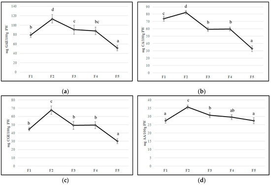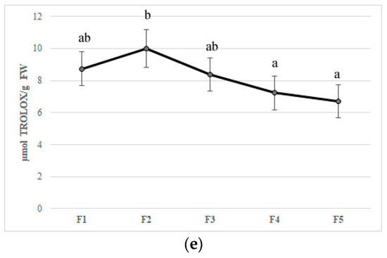 Bioactive compounds content (a) polyphenols, (b) flavonoids, (c) anthocyanins, (d) ascorbic acid, and (e) antioxidant activity in five different flowering stage of feijoa (F1, F2, F3, F4, F5). Means followed by the same letter do not differ significantly at P = 0.05 (Duncan Test).