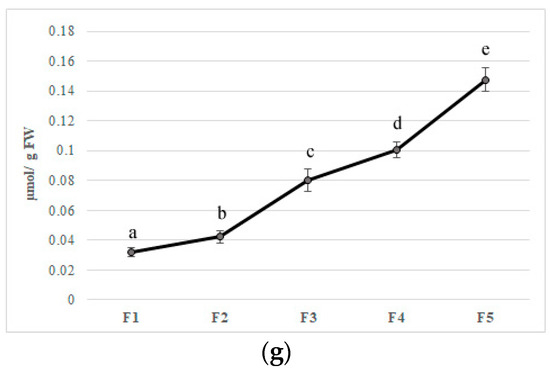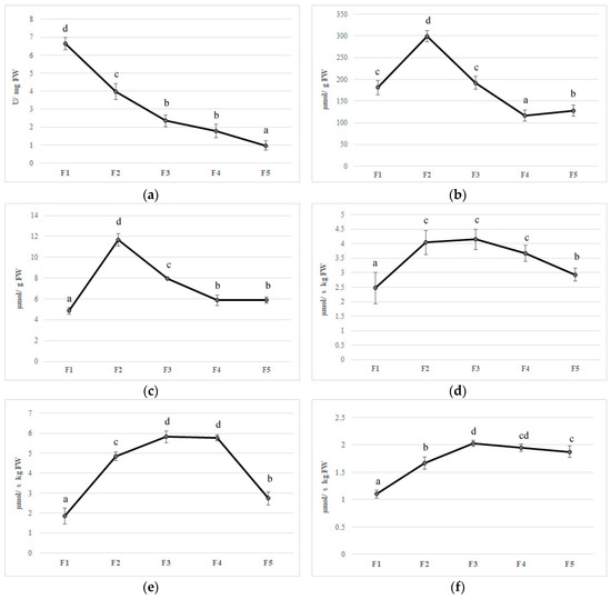 Antioxidant enzymes activities (a) superoxide dismutase, (b) catalase, (c) ascorbate peroxidase, (d) monodehydroascorbate reductase, (e) dehydroascorbate reductase, (f) glutathione reductase, and (g) polyphenoloxidase in five different flowering stage of feijoa (F1, F2, F3, F4, F5). Means followed by the same letter do not differ significantly at P = 0.05 (Duncan Test).