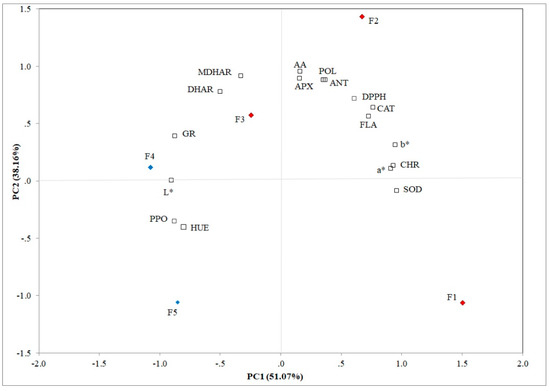PCA allows establishing the principal components (PCs) that clarified the overall variance in all analyzed traits. The first two principal components explained 89.23% of the variation (51.07% and 38.16% for PC1 and PC2, respectively) in feijoa flowers and these components showed eigenvalues ≥ 0.80 (Figure 5). SOD (r2 = 0.963), FLA (r2 = 0.729), DPPH (r2 = 0.764), CHR (r2 = 0.935), a* (r2 = 0.912), and b* (r2 = 0.949) were positively correlated to PC1; whereas, PPO (r2 = −0.878), GR (r2 = −0.874), L* (r2 = −0.901), and HUE (r2 = −0.802) were negatively correlated with the first principal component. CAT (r2 = 0.715), APX (r2 = 0.892), MDHAR (r2 = 0.912), DHAR (r2 = 0.777), POL (r2 = 0.877), and AA (r2 = 0.952) showed a positive correlation to PC2. Ascorbic acid, POL, ANT and FLA contents, APX, antioxidant (DPPH), and CAT activities were positively correlated to F2, whereas MDHAR and DHAR activities were positively correlated to F3. Furthermore, L*, PPO, and GR activities were positively correlated to F4.