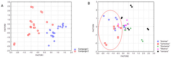 Principal component analysis (PCA) score plots showing the projection of strawberry samples in the plane defined by the following principal components: (A) PC1 vs. PC2, separation of samples according to the campaign; (B) PC2 vs. PC4, separation of samples according to the cultivar.