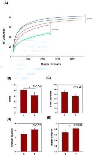 Rarefaction analysis on the sequences obtained from both soy sauce groups indicated satisfactory sequencing depth, as a near plateau level was achieved at approximately 2000 reads, particularly for the control group (Figure 1A). The number of OTUs was significantly (p < 0.05) higher in the control soy sauce group compared to that in the coriander group (Figure 1B). There was no significant difference between both groups with respect to Chao1 richness and Shannon alpha diversity index (Figure 1C,D). However, the inverse Simpson index was significantly higher for the coriander soy sauce group compared to that for the control (Figure 1E).