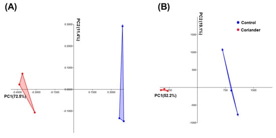 Principle coordinates analysis of (A) Bray–Curtis and (B) Euclidean distances of soy sauce samples prepared by adding coriander during fermentation, compared to those of control. Each dot represents a replicate from the different groups of soy sauce.