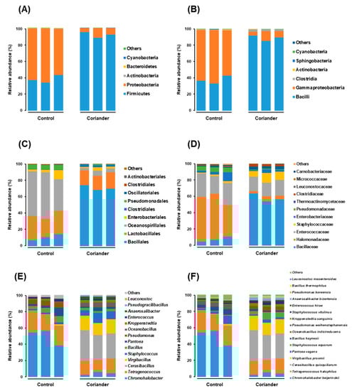 Stacked bar graphs representing the microbiome structure in soy sauce samples prepared by adding coriander, compared to that of control: (A) phylum level, (B) class level, (C) order level, (D) family level, (E) genus level, and (F) species level.