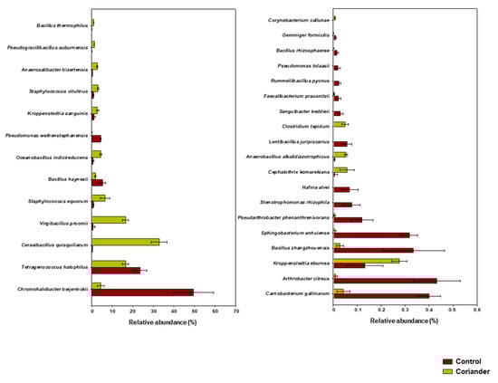 Bacterial species existing with significantly different (p < 0.05) relative abundance in soy sauce samples prepared by adding coriander, compared to those in control. Bars represent means and standard deviations.