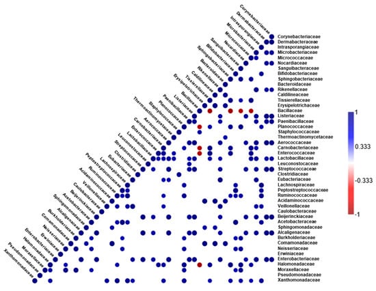 Correlogram representing matrices of Pearson’s correlation coefficient (r) between different bacterial taxa in soy sauce samples (n = 6), at family level. Only significant (p < 0.05) positive (blue) and negative (red) correlations are shown in the graph.