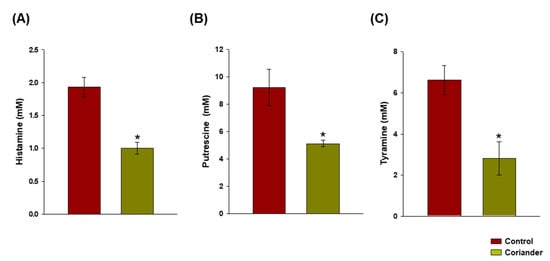 Quantification of biogenic amines, (A) histamine, (B) putrescine, and (C) tyramine, in Korean soy sauce samples prepared by adding coriander during fermentation, compared to those in the control. *: a significant difference at p < 0.05.