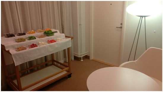 In conclusion, the multisensory room conditions in this study did not change the food intake of the subjects. Fresh, colorful and a varied vegetable selection at lunch is appealing and could promote the consumption of vegetables and sustainable eating habits. In addition to fresh vegetables and fruit, salad buffets usually include other components and thus the overall nutrient composition and healthiness of the lunch depends on individual consumer choices. A pleasant and relaxing ambience may elicit positive feelings and thus enhance meal satisfaction and wellbeing []. The promotion of positive eating situations among various consumer groups deserves further study.