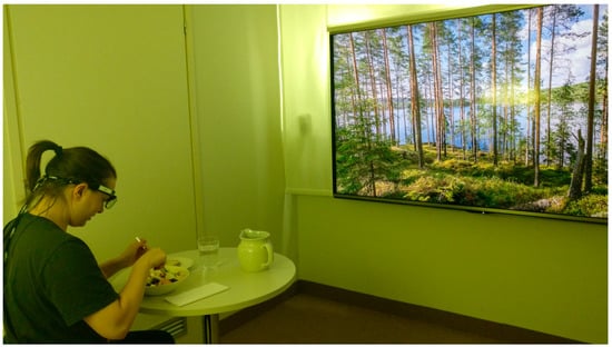 The multisensory laboratory equipment included an odor diffuser (Pump unit BB-200, @aroma GmbH, Berlin, Germany) and controlled illumination (five bulbs on the wall and three bulbs in a floor lamp, Hue, Philips, Amsterdam, Netherlands). The audio-visual multimedia system included an 80-inch Apple-tv (Apple Inc., Cupertino, CA, USA) and an audio system with two speakers (Genelec Oy, Iisalmi, Finland). In the control condition, the neutral room lighting system was used. In addition, there was no sound, no scent and no visual landscape on the screen. In the multisensory condition, there was a landscape of a pine forest and lake during summertime and bright lighting, matching the color tones of the landscape on the screen (Figure 2). The soundscape was birdsong in a Finnish summertime forest with various species of bird (recorded in Kortesjärvi in June). Orange scent (Orange Oil Sweet Brazil Pera, @aroma GmbH, Berlin, Germany) was diffused to the room with an odor diffuser for 30 s before a subject entered the room and then for 5 s in 3 min intervals until the subject had finished eating.