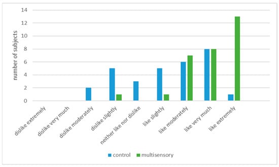 The eating time did not differ significantly between the two conditions (control 12.8 min vs. multisensory 13.0 min). Considering fullness after the meal, the proportions of responses were exactly the same for both conditions: 47% reported feeling very full and 50% fairly full. Contentment with the salad was also good for both conditions. In the multisensory condition, 83% were very satisfied with the salad compared with 77% in the control condition (non-significant difference). Liking ratings of the testing environment differed (Figure 3). Overall, the multisensory condition was significantly more pleasant than the control (p < 0.001).