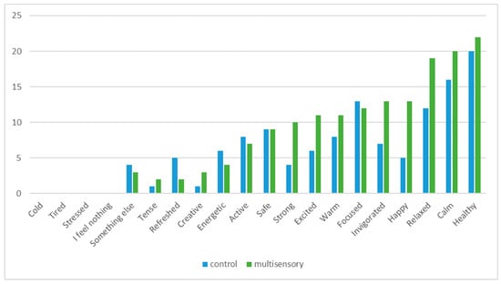 The selected emotion terms under the control and multisensory conditions are presented in Figure 4. Most of the selected terms were positive for both conditions. Over two-thirds of the participants felt healthy in both test environments. No one stated that they felt stressed, cold or tired in either condition. Respondents chose the term “happy” more often in the multisensory condition (n = 13) compared with the control (n = 5); p = 0.02, McNemar’s test. The subjects also tended to select the terms “relaxed” (p = 0.09) and “strong” (p = 0.07) more often for the multisensory condition.