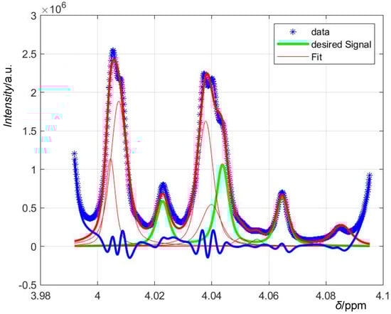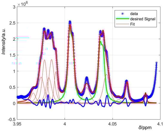 J = 0 Hz, if the multiplet’s complementing peaks could be found at the other expected positions in the same column of JRES data. After confirmation of the multiplet’s existence and determination of its exact chemical shift (in this sample), precise starting values for the curve fitting were calculated.