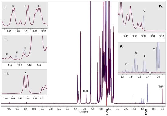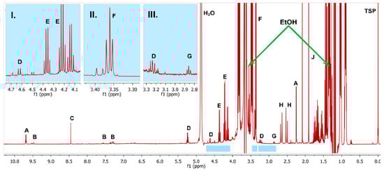 Before analysis, the spirit drinks were filtered or centrifuged (especially required for turbid samples). For the sample preparation, 500 µL of spirit drinks was mixed with 100 µL buffer solution, and 400 µL water–ethanol-mixture (190 mL and 50 mL) resulting in a dilution factor of 50%, compared to the spirit drink’s original concentrations. For direct measurement, 600 µL of the sample preparation was transferred into a 5 mm NMR tube (with <1% volume variation, e.g., Wilmad Labglass Inc., Vineland, NJ, USA).