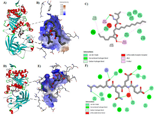 Molecular docking diagrams exemplifying interactions between pancreatic lipase (PL) enzyme (PDB: 1LPB) and inhibitors. (A) Example of the pose of orlistat with the enzyme PL. (B) The identified pocket of PL interact with orlistat determined by molecular docking. (C) Potential interactions with the amino acid residues from the PL catalytic site in two dimensional (2D) with orlistat. (D) The best pose of peptide EEQR with the enzyme PL. (E) The identified pocket of PL interact with peptide EEQR determined by molecular docking. (F) Potential interactions with the amino acid residues from the PL catalytic site in 2D with peptide EEQR.