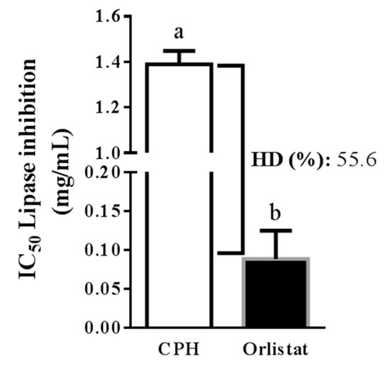 IC50 (concentration needed to inhibit 50% of enzyme activity) of cocoa protein hydrolysate (CPH) and orlistat against pancreatic lipase. HD: hydrolysis degree. The data are represented as mean ± standard error of the mean (SEM) of n = 3. a, b indicate significantly different values (p < 0.0001).
