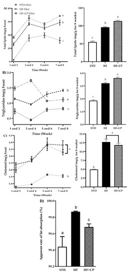 Levels of lipid, cholesterol, and triglycerides in feces for 8 weeks. (A) Total lipids in feces for 8 weeks, (B) triglycerides, (C) cholesterol in feces for 8 weeks, and (D) apparent absorption rate of the fat. The data are represented as mean ± standard error of the mean (SEM) (n = 7) per group during 8 weeks of treatment. STD: standard diet, HF: high-fat diet, and HF + CP: high-fat diet + 150 mg/kg/day cocoa protein. a, b, c indicate significantly different values (p < 0.05).
