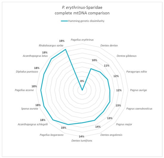 Hamming distance comparison results showed that the genetic dissimilarity among mtDNA of P. erythrinus and other sparid species varies from a minimum of 10% (Dentex dentex) to a maximum of 19% (Acanthopagrus latus and Rhabdosargus sarba) (Figure 2). In Figure 2, the species are ordered clockwise from the species closest to the farthest from P. erythrinus. Statistical analysis was reported in Ceruso et al., 2019 [20].