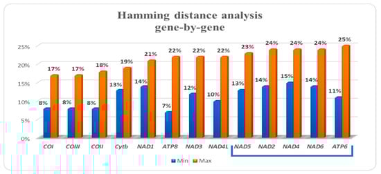 The Hamming distance was also studied comparing each mitochondrial gene. Results showed that the five genes with higher values of genetic dissimilarity were ATP6 (25%), NAD2 (24%), NAD4 (24%), NAD6 (24%), and NAD5 (23%) (Figure 3).