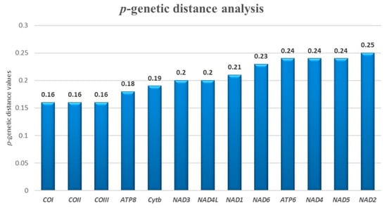 p-genetic distance analysis. The genes were sorted by increasing p-distance values. The gene with the lowest value is COI, while the gene with the highest value is NAD2.