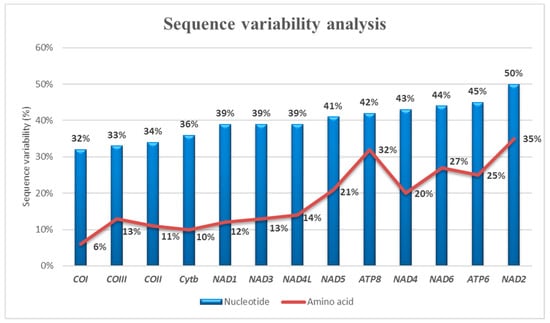 Accordingly, nucleotide sequence variability analysis displayed the highest values in the NAD gene group (NAD1 39%, NAD2 50%, NAD3 39%, NAD4L 39%, NAD4 43%, NAD5 41%, NAD6 44%) (Figure 5). About amino acidic sequences, NAD2 (35%) and ATP8 (32%) proteins showed the highest variability (Figure 5).
