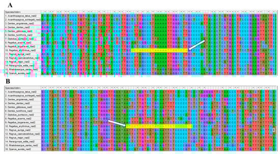 Species-specific primer alignment on Sparidae NAD2 orthologous genes. Primers (highlighted in yellow) aligned only in P. erythrinus (sample n. 10). White arrows show the 3′ end species-specific position. (A) Primer FW303. (B) Primer REW593 (reverse-complement).