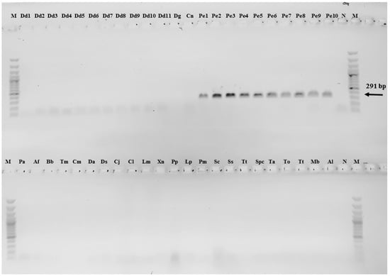 Endpoint-PCR amplification was obtained in all the 10 genomic DNA samples of P. erythrinus. No amplification occurred in the DNAs of other fish species (Figure 7).
