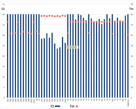 All the P. erythrinus samples gave an amplification with a Ct (Cycle Threshold) between 23 and 31 (a low Ct indicates the presence of the specific fragment used in the experiment) and a Tm between 78 °C and 79 °C (as expected). All the other species gave an amplification with Ct between 36 and 40 (where 40 means undetectable signal, like the negative control) and Tm that varied between 60 °C (the negative control) and 72 °C (Figure 8), indicating the presence of a very small amount of a non-specific product.