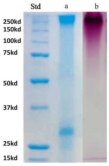 Sodium dodecyl sulfate-polyacrylamide gel electrophoresis (SDS-PAGE) of the freeze-dried polysaccharides (UFS). The glycoproteins were stained on the electrophoretic gel with Bio safe Coomassie (a) and with Schiff’s reagent (b). Std: Blue precision plus molecular weight standards.