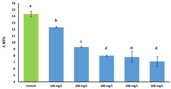 Haziness of Vernaccia wine added with increasing amounts of UFS (from 100 mg/L to 600 mg/L) as obtained by nephelometry after heating treatment. Control: Vernaccia wine without UFS. Error bars represent standard deviation of three independent experiments, each carried out in duplicate. Values displaying different letters (a, b, c, d) are significantly different (One-way ANOVA, Tukey’s post-test, p = 0.05).