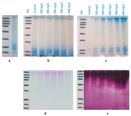 SDS-PAGE electrophoresis of Vernaccia wine proteins before the heat stability test (a) and of the two fractions, haze (HF) (b–d) and supernatant (SF) (c–e), obtained after centrifugation of the wines added with increasing amount (mg/L) of freeze-dried polysaccharides (UFS) and heat treated. Control: Vernaccia wine with no UFS addition. The proteins were stained on the electrophoretic gel with Bio safe Coomassie (b,c) and with Schiff’s reagent (d,e). Std: Blue precision plus molecular weight standards.
