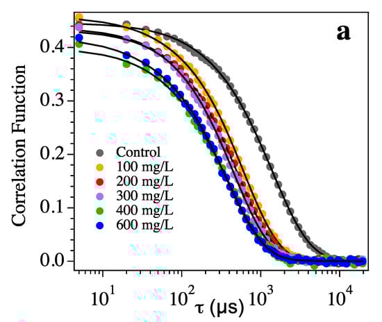 Dynamic light scattering (DLS) was also performed on the heat-treated samples of wine to determine the size distribution of the suspended aggregated proteins. DLS measures the Brownian motion of the objects in the sample and relates this to the size of the particles [73]. Figure 5a reports the correlation functions for all the investigated samples, while Figure 5b shows the mean diameters obtained from the fitting of the curves with the CONTIN algorithm together with the number of scattered photons expressed as kilocounts per second (kcps). The comparison between the number of scattered photons in the heated and not-heated samples is shown in Figure 5c.