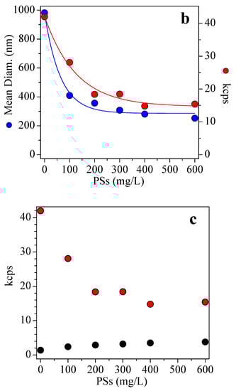 The presence of scattering objects in the heated samples can be ascribed to the formation of protein aggregates induced by thermal treatment. Indeed, the comparison between the number of scattered photons in the wine aliquots before and after heating (Figure 5c) confirms the lower number of aggregates in the as-prepared wine samples. Interestingly, the size of the haze particles decreased as the concentration of added polysaccharides increased (Figure 5b). The relationship between the haze particle size and PSs concentration is similar to that found for the turbidity (i.e., exponential function), with the decrease in particle size of the aggregate diminishing to less than 0.3 μm at the highest addition of PSs. As a consequence of this reduction, the haze was barely detectable with the naked eye. Variation of ΔNTU, kcps and mean diameter of the aggregate could be modeled by the function: y(C) = y0 + Aexp-(C/C*), where the y0 is the baseline of the exponential, A is its amplitude and C* represents the critical concentration of additive able to reduce the destabilization phenomenon by a factor 1/e. C*, resulting from the fits of three curves, is in the range 100–200 mg/L.