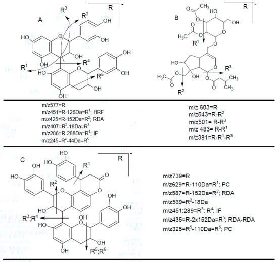 Hypothetic structures of selected daughter ions resulting from MS-MS fragmentation of the compound 13 procyanidin dimer B2 (A), 45 opulus iridoid II (B), and 28 cinchonain IIx (C). HRF—heterocyclic ring fussion; PC—phenyl cleavage; RDA—retro-Diels-Alder reaction; IF—interflavan fussion.