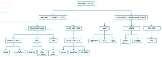 3D printing is a novel pre-processing technology used in foods, where extrudable food is printed into specific shapes of uniform structure or layers using a 3D printer. There are several categories and ingredients of printable food (Figure 1). 3D printing enables automation, waste reduction, and personalization of foods. Meat should be processed into an extrudable form with added binders or texturizers, such as hydrocolloids or gellable proteins, so that meat can be 3D printed [52,53]. In addition to this, meat should be in a viscoelastic form so that it can be printed into the specific structure [53].